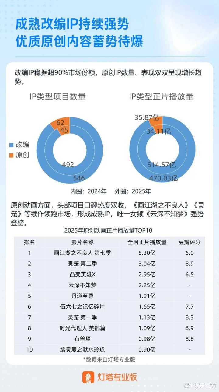 根据《灯塔2025年动漫市场报告》,全年在播的406部国漫中,仅26部年番便贡献了全年国漫总播放量的47%,成为市场中无可争议的中坚力量。