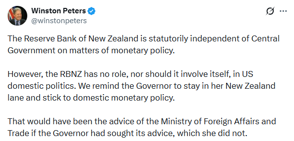彼得斯称:“新西兰央行在美国国内政治中没有角色,也不应置身其中。我们提醒行长,请待在她的新西兰车道上,专注于国内货币政策。”他另外表示,如果行长寻求建议,外交贸易部也会提供同样的建议,“但她并没有这样做”。