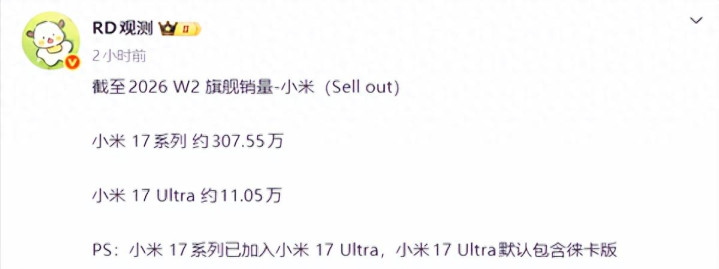 截至 2026 年 1 月第 2 周,小米 17 系列的总销量已经突破了 307.55 万台。
