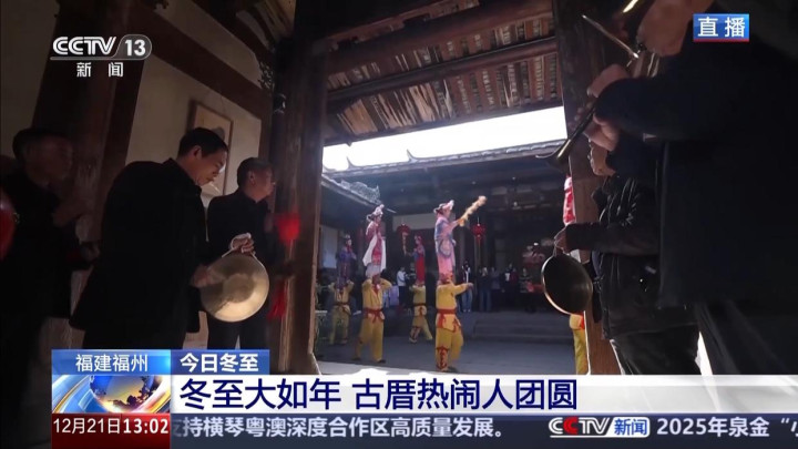 总台记者赵晟萱:我所在的位置是福州市罗源县的潮格村,今天是冬至节气,在当地一直有着“冬至大如年”的说法,今天跟春节一样都是格外重要的团圆时刻。在我身后的古厝小院里,灯笼高挂,男女老少聚在一起,听戏品美食,一起过冬至。