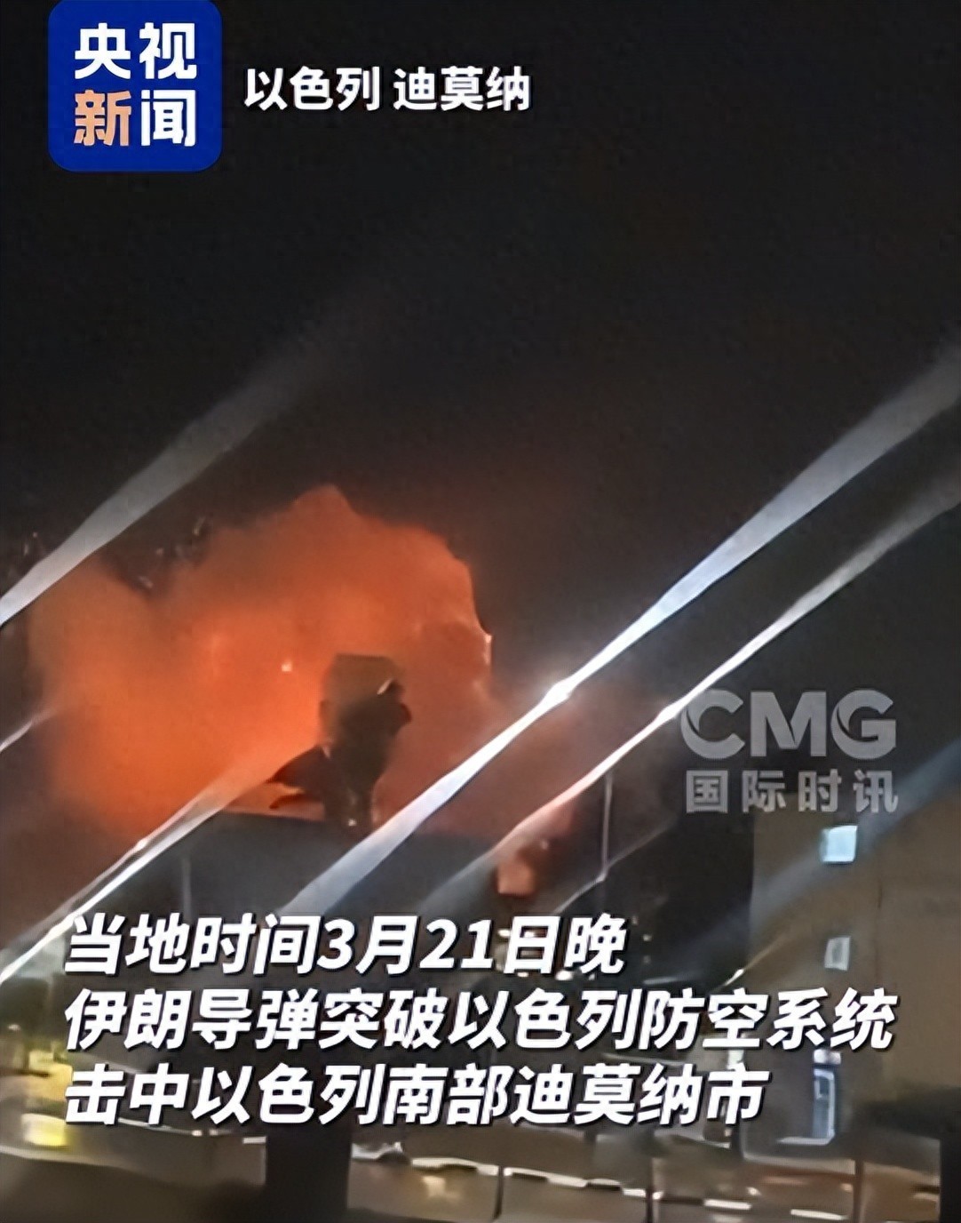 当地时间3月21日晚,伊朗发射导弹打击以色列南部的迪莫纳和阿拉德市等多地。有目击者拍摄到了以色列防空系统拦截伊朗导弹失败的瞬间。画面显示,伊朗导弹绕过拦截弹后击中地面目标。