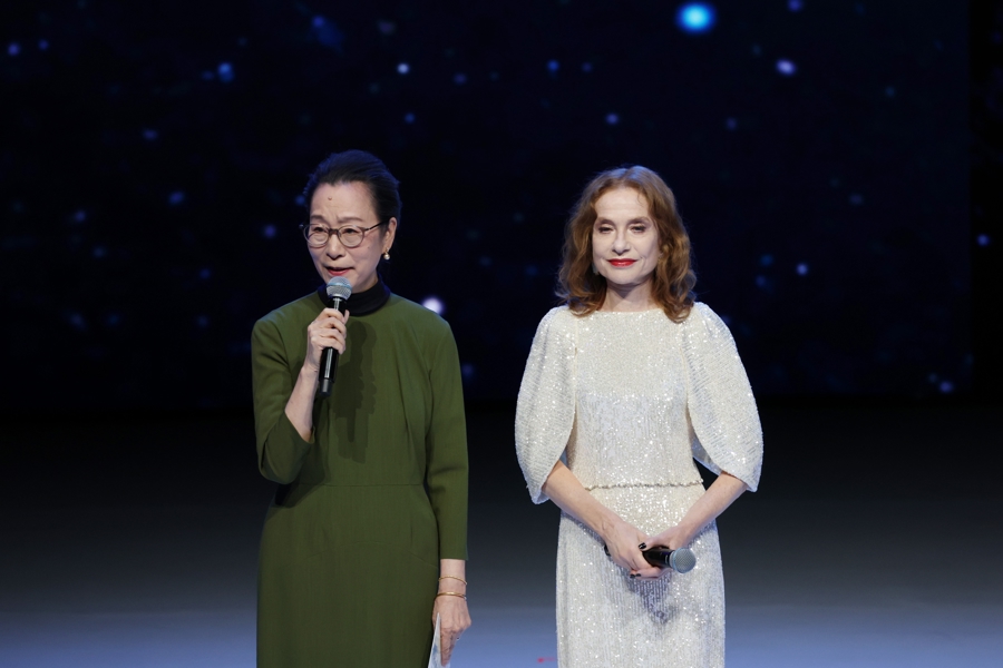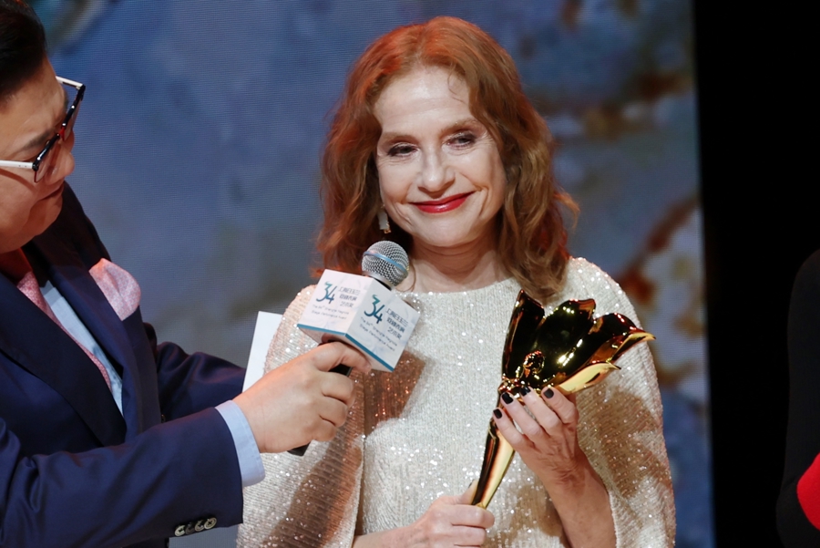 在颁奖晚会上,于佩尔与中国艺术家奚美娟朗诵取材于法国作家维克多·雨果《巴黎圣母院》的中法双语诗歌《玫瑰与火焰》。私下,两人交流表演作品。听说奚美娟演了十年《北京法源寺》,于佩尔说,“希望我有一部舞台剧能演十年,未来带着更多作品来中国。”